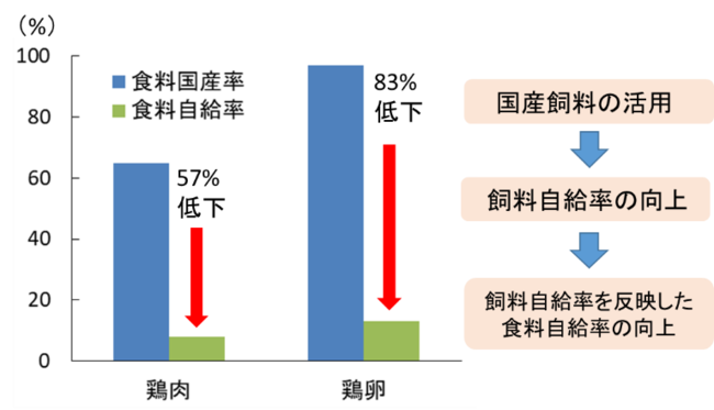国産鶏の飼料の主な原料はトウモロコシと大豆粕で、いずれも輸入に依存しています。農林水産省の「令和3年度食料自給率・食料自給力指標について」によると、令和3年度の鶏肉および鶏卵の「飼料が国産か輸入かにかかわらず(飼料自給率を反映しない)国内生産した割合[食料国産率]」はそれぞれ65%および96%ですが、「国産飼料のみで(飼料自給率を反映した)国内生産した割合[食料自給率]」は、それぞれ8%および13%に低下します(グラフ参照)。