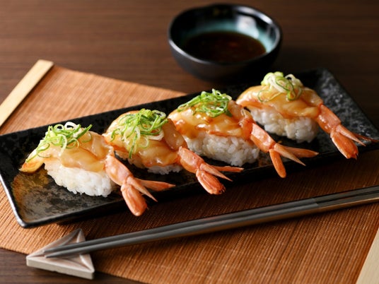 程よい甘さの醤油ダレがしみ込んだ生海老をにぎり寿司で!プリプリ、ねっとり食感を存分にお楽しみください。
