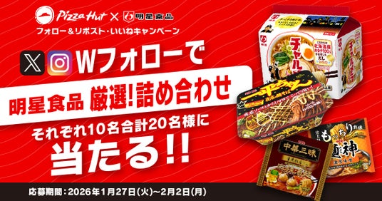 2026年1月27日(火)より、ピザハット公式Xアカウントと公式Instagramアカウントにて、抽選で各10名様(計20名様)にコラボを記念した【明星食品 厳選!詰め合わせ】が当たるプレゼントキャンペーンを実施いたします。