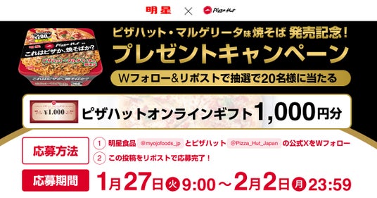 2026年1月27日(火)より、明星食品公式Xアカウントにて、抽選で20名様にコラボを記念した「ピザハットオンラインギフト(1,000円分)」が当たるプレゼントキャンペーンを同時開催いたします。