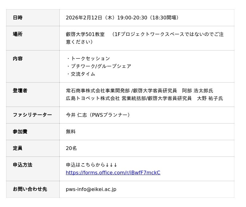 叡啓大学(学長:有信睦弘、広島市中区)は、2月12日(木)、叡啓大学のプロジェクトワークスペースにて、PWS月次イベント:社会人キャリアラボ#3~Iターン実践者が語る“広島で働く”というキャリア~ を開催いたします。