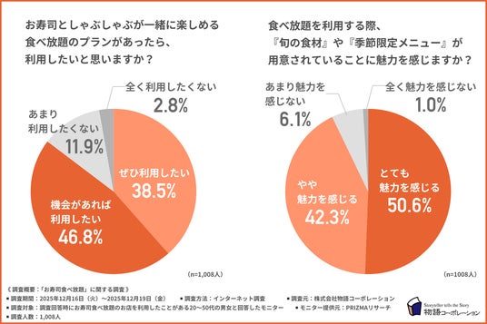 こうした「肉も魚も」という潜在的なニーズを証明するように、お寿司としゃぶしゃぶを同時に楽しめる食べ放題プランに対して、約8割が利用意欲を示しました。