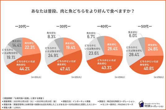 年代が上がるにつれて魚派が増えるという一般的なイメージに反し、50代においても約7割が肉を好むと回答しています。