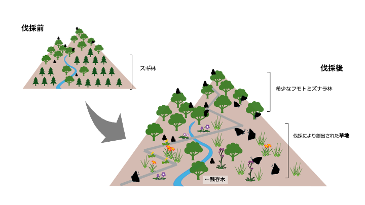 本プロジェクトは、林業の全工程にチョウの保全、生息環境の再生を組み込んだ日本初※の取り組みです。青葉組が設立・運営している一般社団法人とちぎ百年の森をつくる会(以下、とち森会)の会員である伐採事業者Forest One社と連携し、伐採前にチョウの通り道を配慮した作業道設計から、保残木の選定、草地エリアとチョウの食草に配慮した植栽樹種の設定など、一貫してチョウの保全を念頭に置いた森づくりを行います。