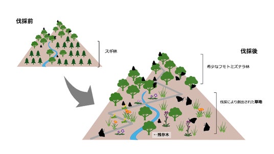 【「日本初」の定義】民間企業が行う商業的な林業(伐採再造林)において、伐採前の作業道設計から植林・草地管理まで、特定のチョウ類の「保全」だけでなく「再生(生息環境を増やす)」を目的に、林業の全工程へ具体的措置を組み込んだ取り組みは国内で例がなく、特に保持林業と呼ばれる伐採区域内の広葉樹を保残しながら取り組んだ事例としては、本プロジェクトが日本初の試みとなります。