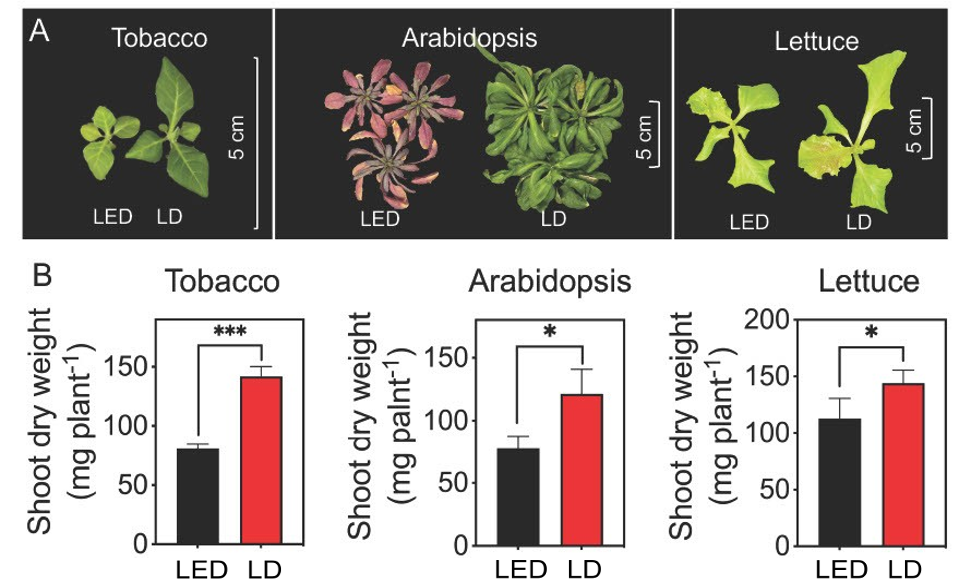 図2. LD(赤)とLED(黒)が植物全体の生育に与える影響(B:t検定を実施(n=4)、*は有意差あり(p<0.05))