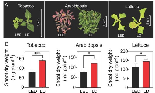 さらに、植物体全体の生育(乾燥重量=Dry Weight、葉面積、形態変化)への影響についても評価を行いました。図2には、A.生育状況と、B.乾燥重量に関するLDとLEDの有意差が示されています。