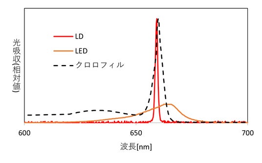 - 赤色LDは同等波長の赤色LEDに比べて「光合成において無駄の少ない、より効率的な光源」である