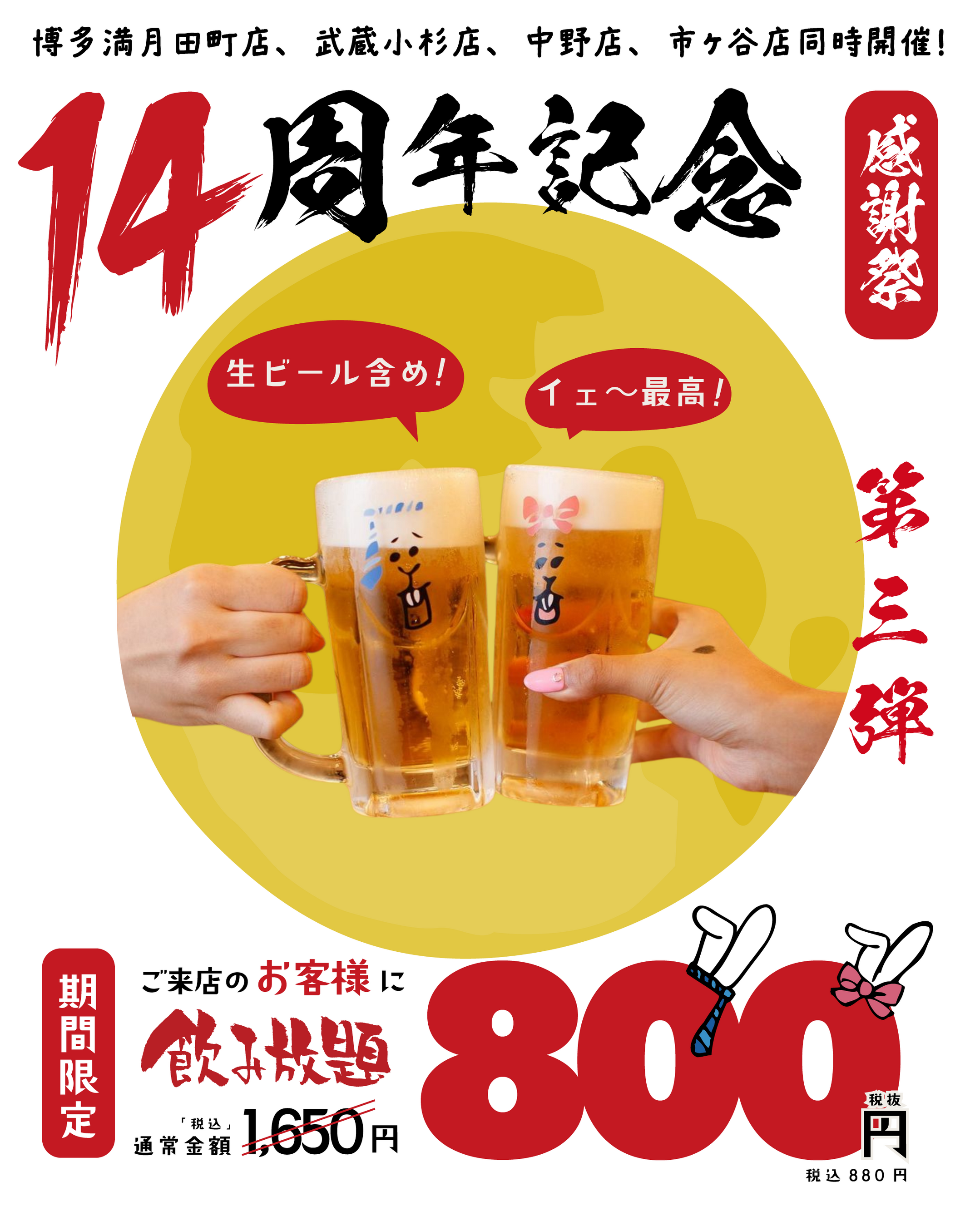 株式会社リロードエッジ(本社:東京都新宿区)が運営する居酒屋「博多満月」は、田町店の14周年を記念し、【田町・武蔵小杉・中野・市ヶ谷】の4店舗合同で“週替わりの感謝祭イベント”を開催いたします。