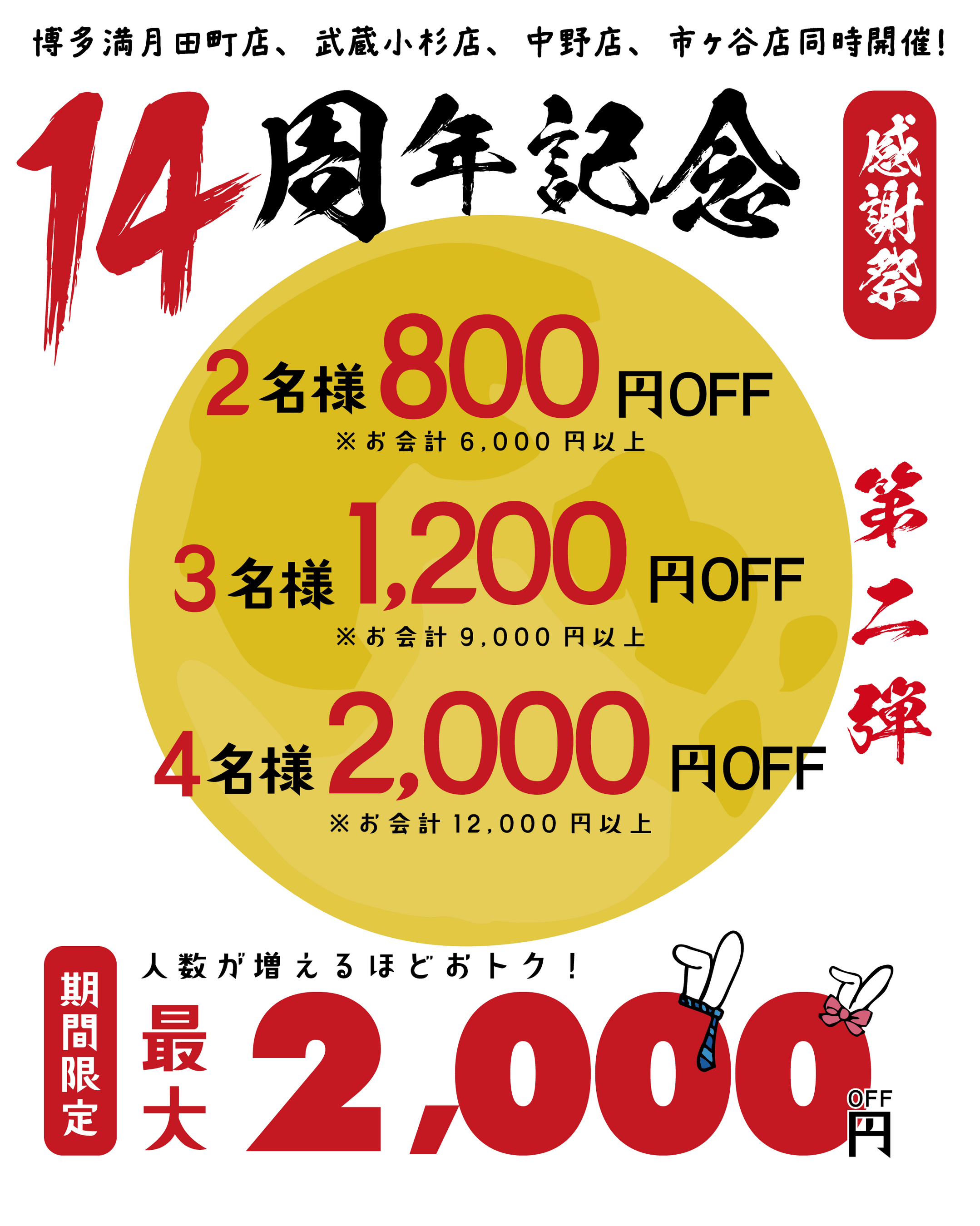 4人以上来店(お会計:税込12,000円以上が対象)?2,000円OFF