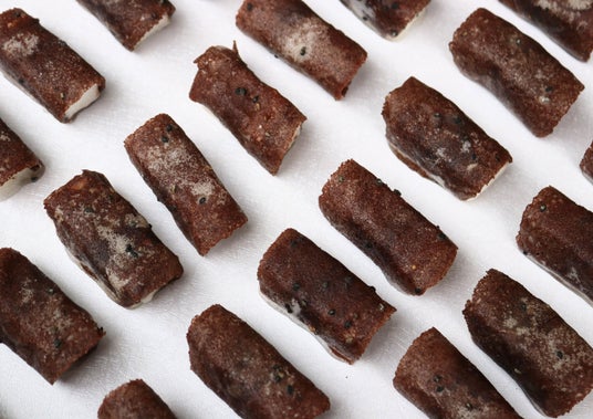 外側のカステラ生地にココアをふんだんに使い、ふわふわで雪のようなくちどけの阿わ雪をやさしく包み、仕上げに胡麻入りのお砂糖で表面をコーティングしています。