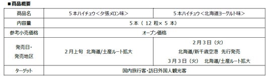 このたび発売する<北海道ヨーグルト味>は北海道産牛乳を、<夕張メロン味>は夕張メロン果汁を使用しています。パッケージは、北海道の旅の思い出が蘇るような広大な大地を印象的に描き、2つの商品を並べるとイラストがつながるデザインにリニューアルしました。さらに、近年「ハイチュウ」が訪日外国人観光客の方からも非常に人気が高いため 、パッケージに「HI-CHEW」ロゴを大きく配置することで、国内旅行客に加え、訪日外国人観光客の皆さまにも分かりやすいデザインにしました。