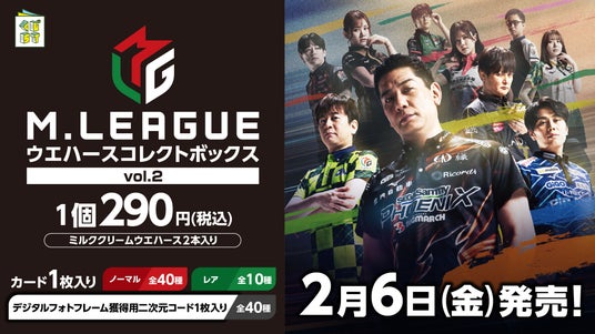 株式会社ダブルカルチャーパートナーズ(本社:東京品川区大崎、代表:高谷有花)は、2026年2月6日(金)より、『M.LEAGUEウエハースコレクトボックスvol.2』をローソン店頭、HMV店頭、@ Loppi・HMV&BOOKS online、ローソン・ユナイテッドシネマにて発売いたします。『M.LEAGUEウエハースコレクトボックスvol.2』には、ウエハースとカード(全50種)が1枚ランダムで封入されています。2025-26シーズンに所属している全選手40名の写真入りカード(ノーマルカード)と、各チーム(10チーム)の集合写真カード(レアカード)があり、すべて撮り下ろした素材を使用しています。