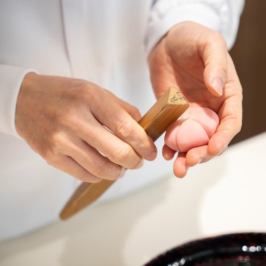 生菓子をお作りいただいた後は、季節に合わせた和三盆の実演をご覧いただき、お客さまに実食いただきます。出来立ての和三盆の口どけをお愉しみください。和三盆の意匠はお任せとなります。