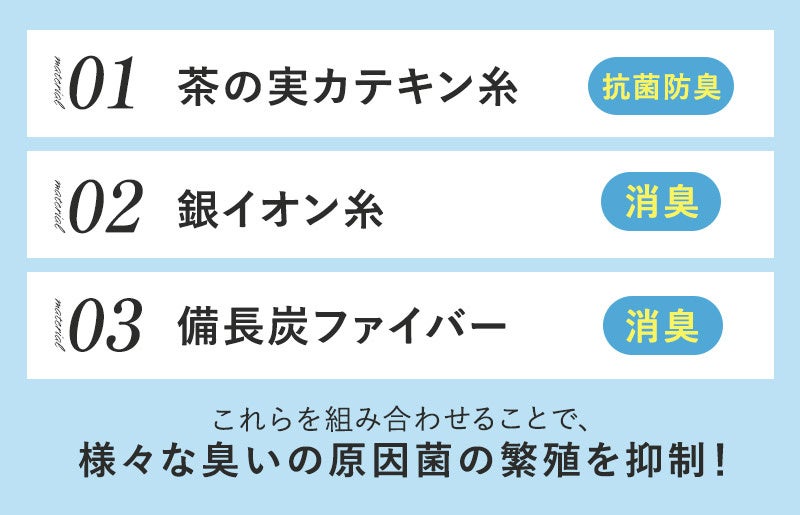 3つの機能糸の特徴を組合せ様々な臭いの原因菌に対して抗菌・防臭・消臭効果を発揮する