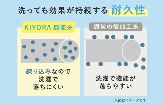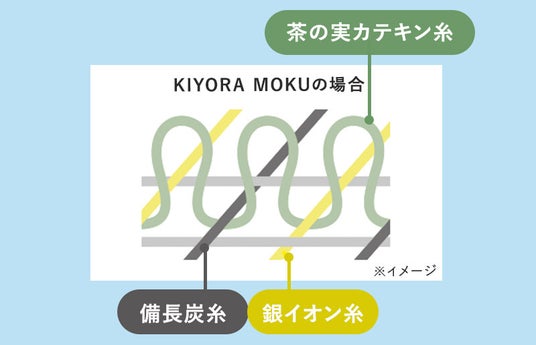「KIYORA」は、抗菌・防臭・消臭機能を練り込みした3つの機能糸を組合せ、タオルそのものが臭いの原因菌の増殖を抑制する設計を採用しています。