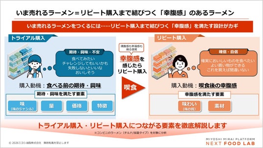 ミヨシトレンド研究所は、独自の消費者調査などをもとに、日常の食事(※1)で満たされるには、「身体的満足=満腹感」と「精神的満足=幸福感」のどちらも得ることが重要であり、満腹感も幸福感も得る感覚を「幸腹感」と名付け、2026年の中食・総菜のトレンドとして着目。さらに、いまの消費者は、再現性のある「幸腹感」を求めて「リピート購入(※2)」を増やしていることにも注目し、いま売れるラーメン、つまりは、リピート購入まで結びつく「幸腹感」を満たすラーメンの設計を分析しました。