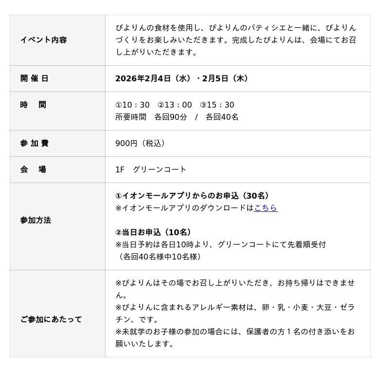 ジェイアール東海フードサービス株式会社(本社:愛知県名古屋市、代表取締役社長:岩下賢一)が展開するオリジナルスイーツ「ぴよりん」の手づくり体験ができるワークショップが、2026年2月4日(水)・5日(木)の2日間、イオンモール大高にて開催されます。本イベントでは、ぴよりんの製造工程の一部を体験しながら、自分だけのぴよりんを手づくりで仕上げ、完成後はその場でお召し上がりいただけます。普段はなかなか見ることのできない“ものづくりの楽しさ”を体感できる、体験型ワークショップです。お子さまから大人の方まで、幅広い世代の方にお楽しみいただけます。