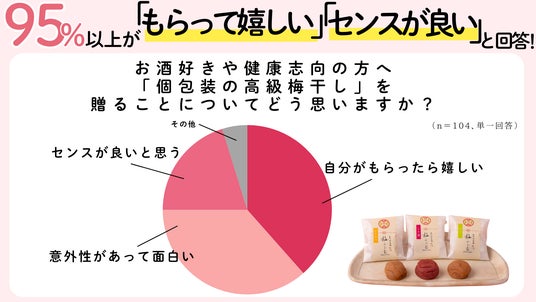 「お酒好きや健康志向の方へ『個包装の高級梅干し』を贈ること」について尋ねたところ、「自分がもらったら嬉しい(38.5%)」、「意外性があって面白い(36.5%)」、「センスが良いと思う(20.2%)」といった肯定的な意見が合計で95.2%に達しました。