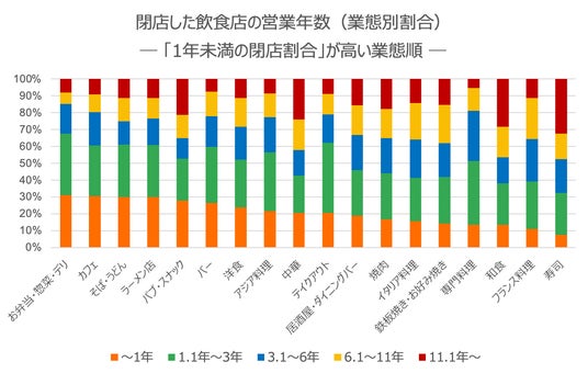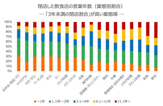 業態別に「11.1年以上営業を継続した店舗」の割合を見ると、寿司(32.5%)、和食(28.4%)、中華(24.1%)といった業態が上位に並びました。