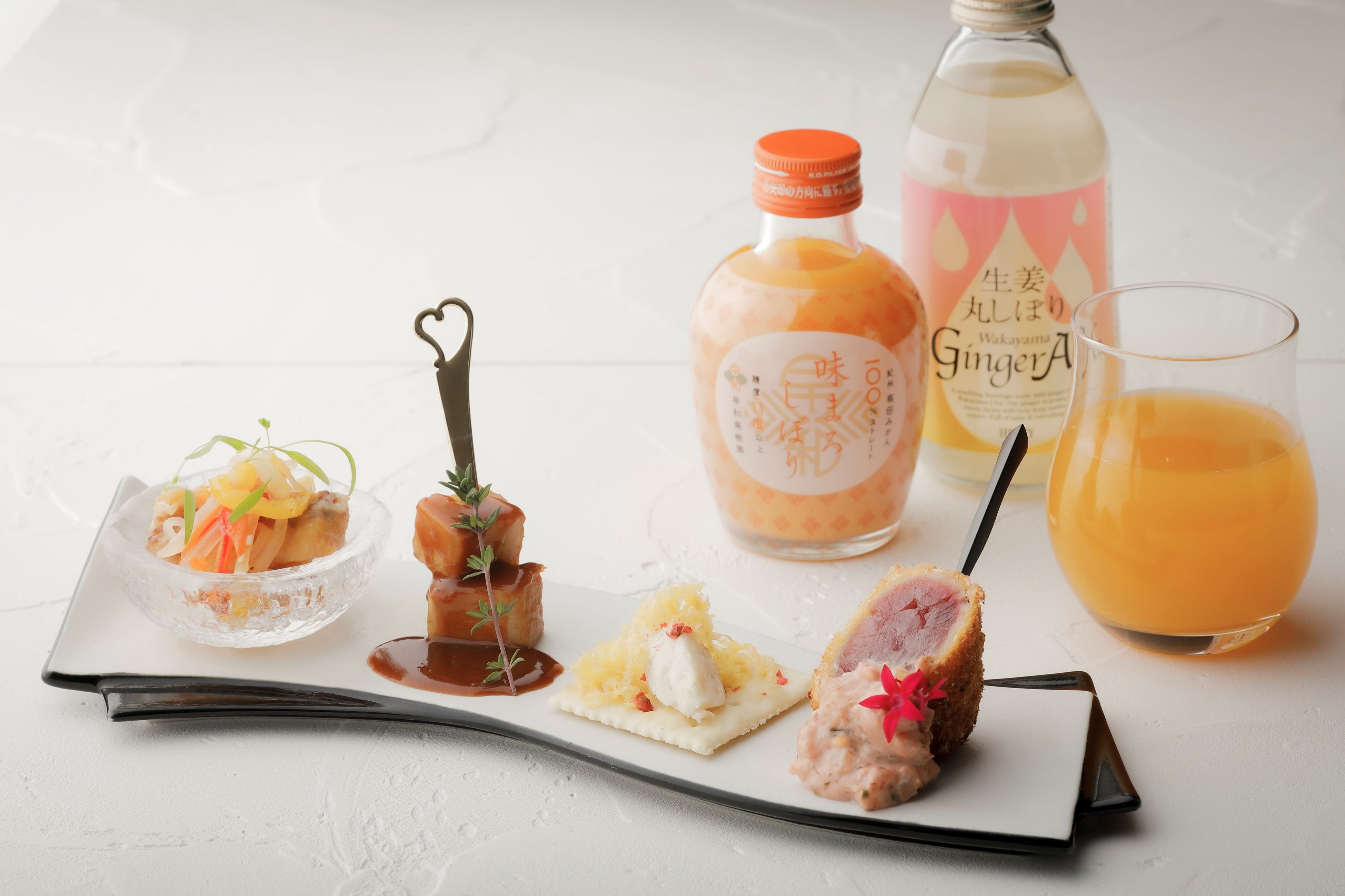 紀州梅まだいのエスカベッシュやうめ豚のコンフィなど、地元食材を活かしたホテル特製おつまみと、優しい甘さが特徴の有田みかんジュースと和歌山県産の生姜を使用したジンジャーエールで作るセルフモクテルを、客室にてお楽しみいただけます。爽やかな酸味と食材の旨みが調和する一杯とともに、春のひとときを心ゆくまでお過ごしください。