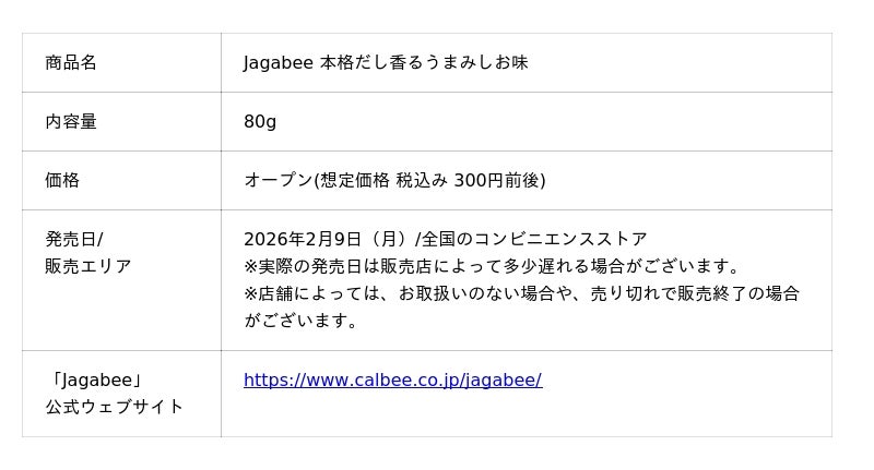 カルビー株式会社(本社:東京都千代田区、代表取締役社長兼CEO 江原 信、以下 カルビー)は、じゃがいもの味わいと独自の食感が楽しめる「Jagabee」ブランドから、株式会社にんべん(本社:東京都中央区、代表取締役社長 高津 伊兵衛、以下 にんべん)監修のもと、「本枯鰹節粉末※1」の風味をいかした『Jagabee 本格だし香るうまみしお味』を2026年2月9日(月)から全国のコンビニエンスストアで数量限定発売します (なくなり次第、終了)。