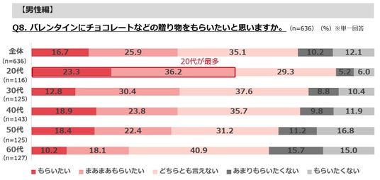 ・バレンタインの贈り物をもらいたい人は4割強、もらいたくない人は2割強。20代はもらいたい人の割合が6割と特に高い。