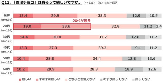 ・義理チョコをもらって嬉しい人は4割強、嬉しくない人は2割強。もらって嬉しい人は20代が5割強とやや高い。