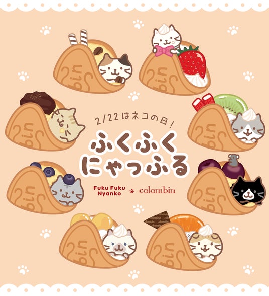 株式会社コロンバン(本社:東京都渋谷区、代表取締役:阿部 二郎)は、REXT株式会社(本社:東京都新宿区、代表取締役:塩田 徹)の人気キャラクター「Fuku Fuku Nyanko(ふくふくにゃんこ)」とコラボレーション。2月22日の「ネコの日」に合わせ、8日間限定の特別商品『ふくふくにゃっふる』 を、2月16日より、原宿スイーツ(旧コロンバン原宿)にて販売いたします。8匹のにゃんこたちそれぞれの個性を活かした、8種類のワッフルをご用意いたしました。コロンバンのふわふわワッフルと、