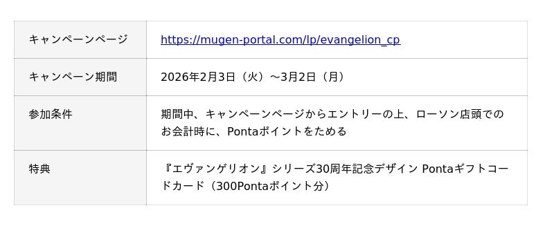 共通ポイントサービス「Ponta(ポンタ)」を運営する株式会社ロイヤリティ マーケティング(本社:東京都渋谷区、代表取締役社長:勝 文彦、以下「LM」)は、人気アニメーション作品『エヴァンゲリオン』シリーズの30周年フェスイベント「EVANGELION:30+; 30th ANNIVERSARY OF EVANGELION」の開催を記念し、2026年2月3日(火)~3月2日(月)、コラボレーションキャンペーンを実施します。