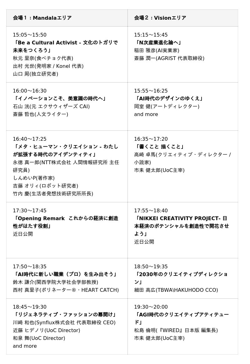 秋元 里奈 (食べチョク代表) / 石山 洸 (元 エクサウィザー ズCAI ) / 稲田 雅彦 (AI実業家) / 岩崎う大(お笑い芸人) / evala (サウンドアーティスト) / 岡室 健 (アートディレクター) / 倉本 美津留 (放送作家) / 栗林 和明 (CHOCOLATE Inc. CCO) / 斎藤 潤一 (AGRIST 代表取締役) / 斎藤 哲也 (人文ライター) / ジューストー沙羅 (プロデューサー(Aww, OpenAI) ) / しんめい P (著作家) / 鈴木 謙介 (関西学院大学社会学部教授) / 鈴木 健太 (映像作家・クリエイティブディレクター) / 高崎 卓馬 (クリエイティブ・ディレクター / 小説家) / 田川 欣哉 (Takram) / 出村 光世(発明家・Konel 代表) / 西村 真里子(ポリネーター(R)?・HEART CATCH) / Bruce Ikeda (ミュージックディレクター) / 細田 高広 (TBWA¥HAKUHODO CCO) / 松島 倫明 (『WIRED』日本版 編集長) / 松本 紹圭 (僧侶) / 山口 周 (独立研究者) / 吉藤 オリィ (ロボット研究者) / 米田 肇 (シェフ) / 市耒 健太郎 (UoC 主宰) ・・・・・その他、各業界のクリエイティブ・リーダーにご参加いただきます。