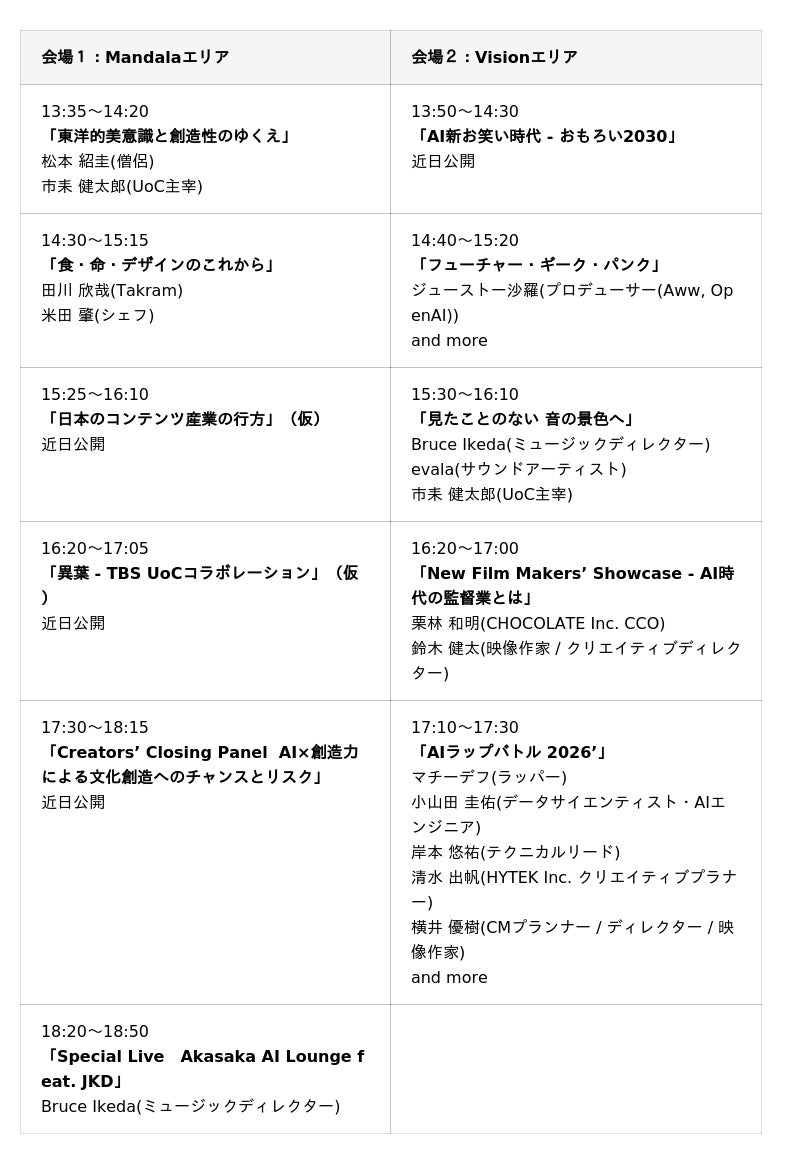 2日間で約20セッションを予定しており、映画、デザイン、サステナビリティ、エンタメ、マーケティング、広告、出版など、多様な領域の第一線で活躍する実践者がご登壇します。AIと創造力が交差する場所で、思考と価値はどのように更新されるのか。分野を越えた視点から問いを共有し議論を深めていきます。