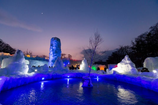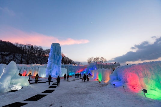 支笏湖の透明度の高い湖水をスプリンクラーで吹き付けて凍らせた、大小様々な氷のオブジェが立ち並ぶ、北海道を代表する冬の祭典で、昼は支笏湖ブルーと呼ばれるナチュラルブルーに輝き、夜は色とりどりのライトに照らされ、幻想的な世界を演出します。