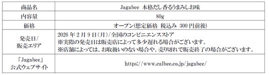 本商品は、『Jagabee 本格だし香るうまみしお味』として、2026年2月9日(月)より、カルビーから全国のコンビニエンスストアにて数量限定で発売されます(※2)。だしのうま味が広がるしお味で、鰹節の風味とじゃがいもの甘みを引き立てる後引く味わいをお楽しみいただけます。