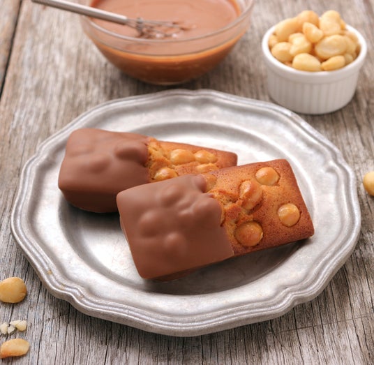 スペイン産アーモンドプードルと国産発酵バターの香りが広がるカリッと香ばしいフィナンシェ生地とほんのり塩味をきかせたマカダミアナッツの食感と味わい、まろやかな口どけのクーベルチュールチョコレートとのマリアージュが楽しめます。