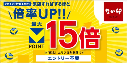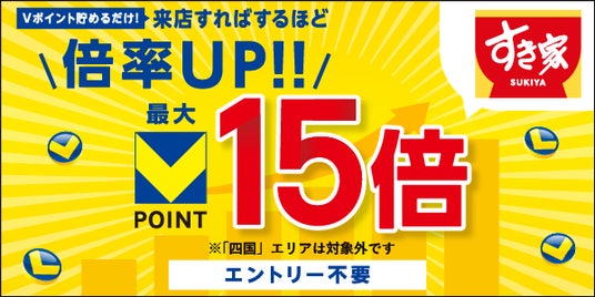 「すき家」「なか卯」では、店舗へのご来店時にモバイルVカードやTカードを提示いただくと、通常のお食事で貯まるVポイント(200円(税込)につき1ポイント)に加え、来店回数に応じて最大15倍のVポイントを進呈いたします。キャンペーン期間中に2回来店で2倍、3回来店で5倍、4回来店で10倍、5回以上の来店で15倍のVポイントが貯まります。