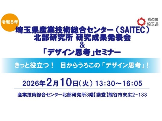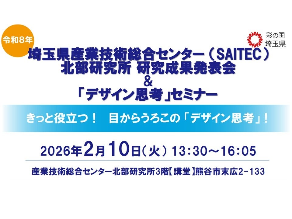 産業技術総合センター(SAITEC)北部研究所では、日頃の研究成果を皆様に御紹介するため、「食とデザイン」をテーマとして「研究成果発表会」を開催します。