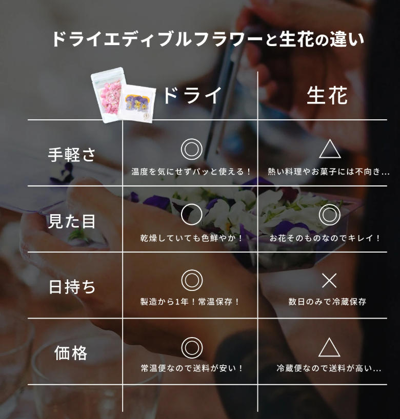 猛暑で生鮮食品のエディブルフラワー(食用花)は傷みやすいが、ドライエディブルフラワー(乾燥食用花)は常温で長期保存できる為、使いたい時に使えてフードロス削減にも繋がることから人気が拡大しています。