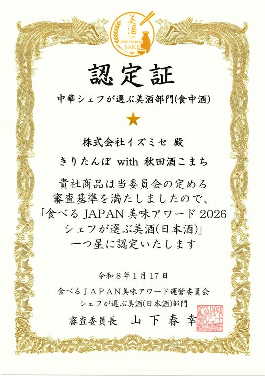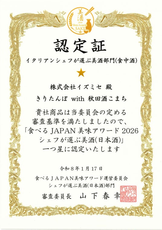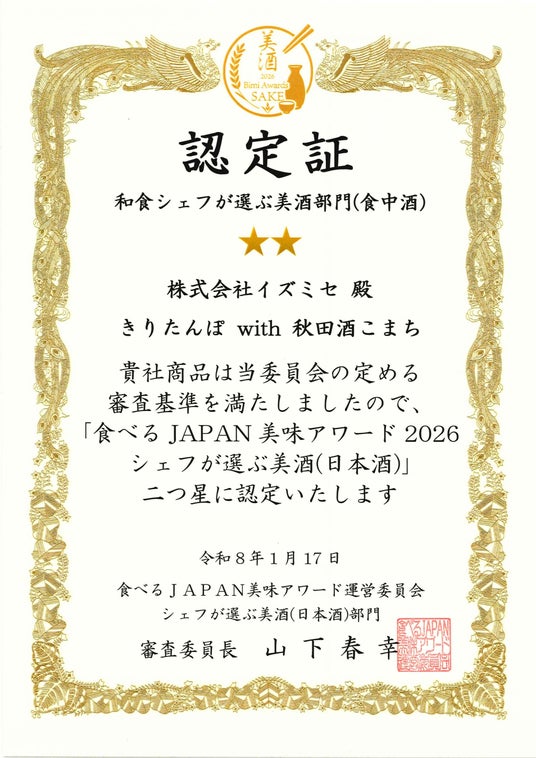 この度、株式会社イズミセ(本社:京都府京都市、代表取締役:戸塚尚孝)が展開する「酒日向。」の「きりたんぽ with 秋田酒こまち」が、「食べるJAPAN 美味アワード2026」美酒部門において認定を受けました。