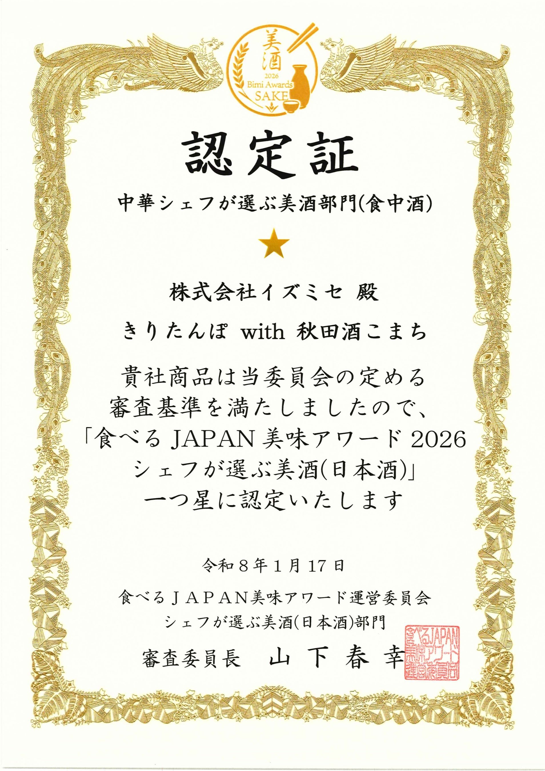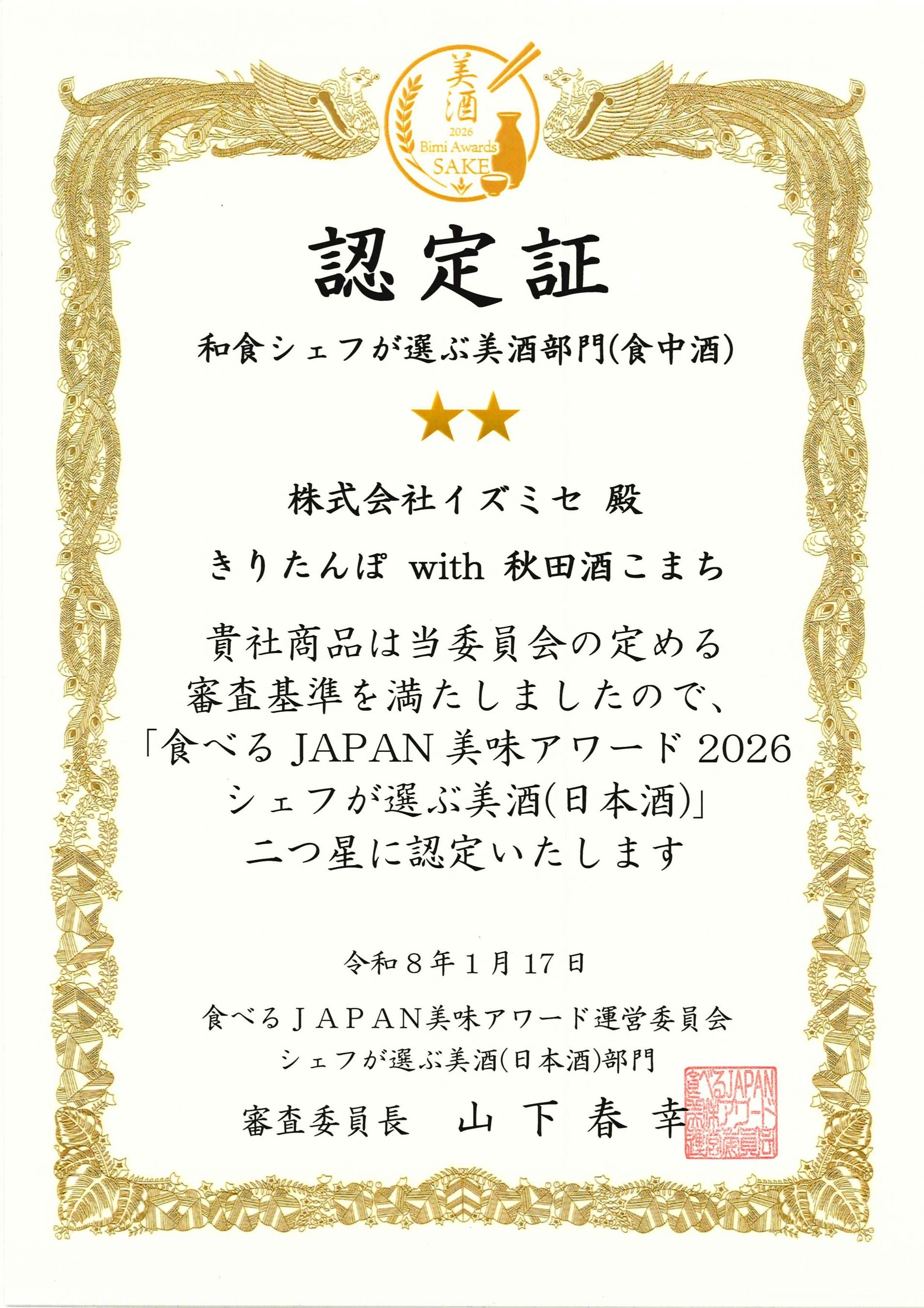 2026年1月に開催された授賞式では、全国から厳選された日本酒の中から、和食・イタリアン・中華それぞれのジャンルを代表するプロのシェフによる試飲審査が行われ、全料理との相性を重視した「食中酒」として高く評価されました。