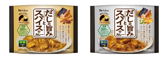 「だしの旨みとスパイスのカレー」は、固形ルウより油脂が少ない中でもおいしさを実現するハウス食品の独自技術「クラッシュルウ」を採用し、カレーらしい深いコクとだし・スパイスの香り高いおいしさを両立しています。また、脂質を50%オフ※に抑えつつ、小麦粉ではなくコーンスターチでとろみをつけることで、さらりとした食べ心地に仕立ています。脂質が気になってカレーを敬遠していた方や、カレーの油脂や小麦粉による食べた後の重たさを感じていた方にぜひおすすめです。