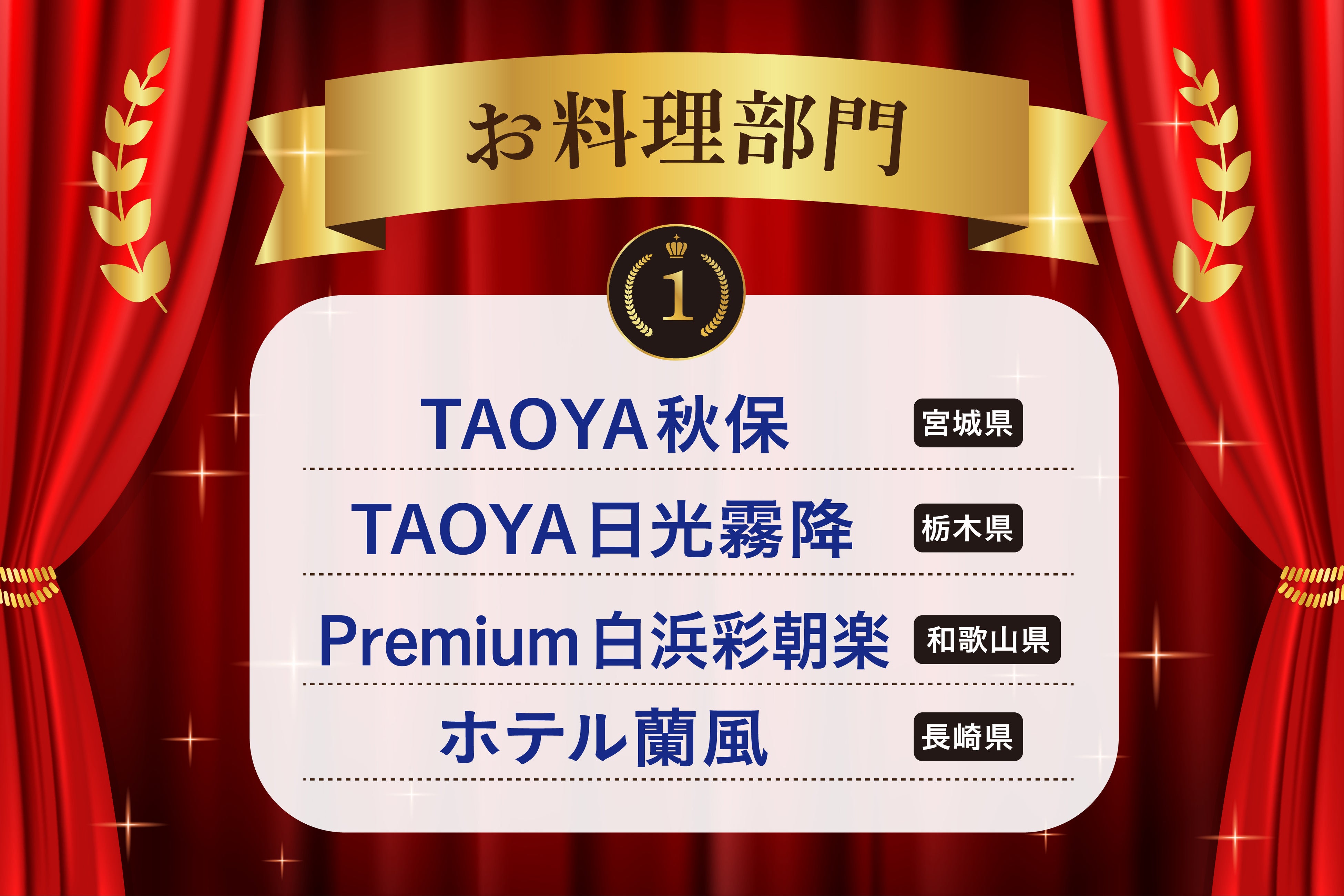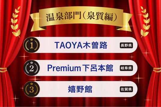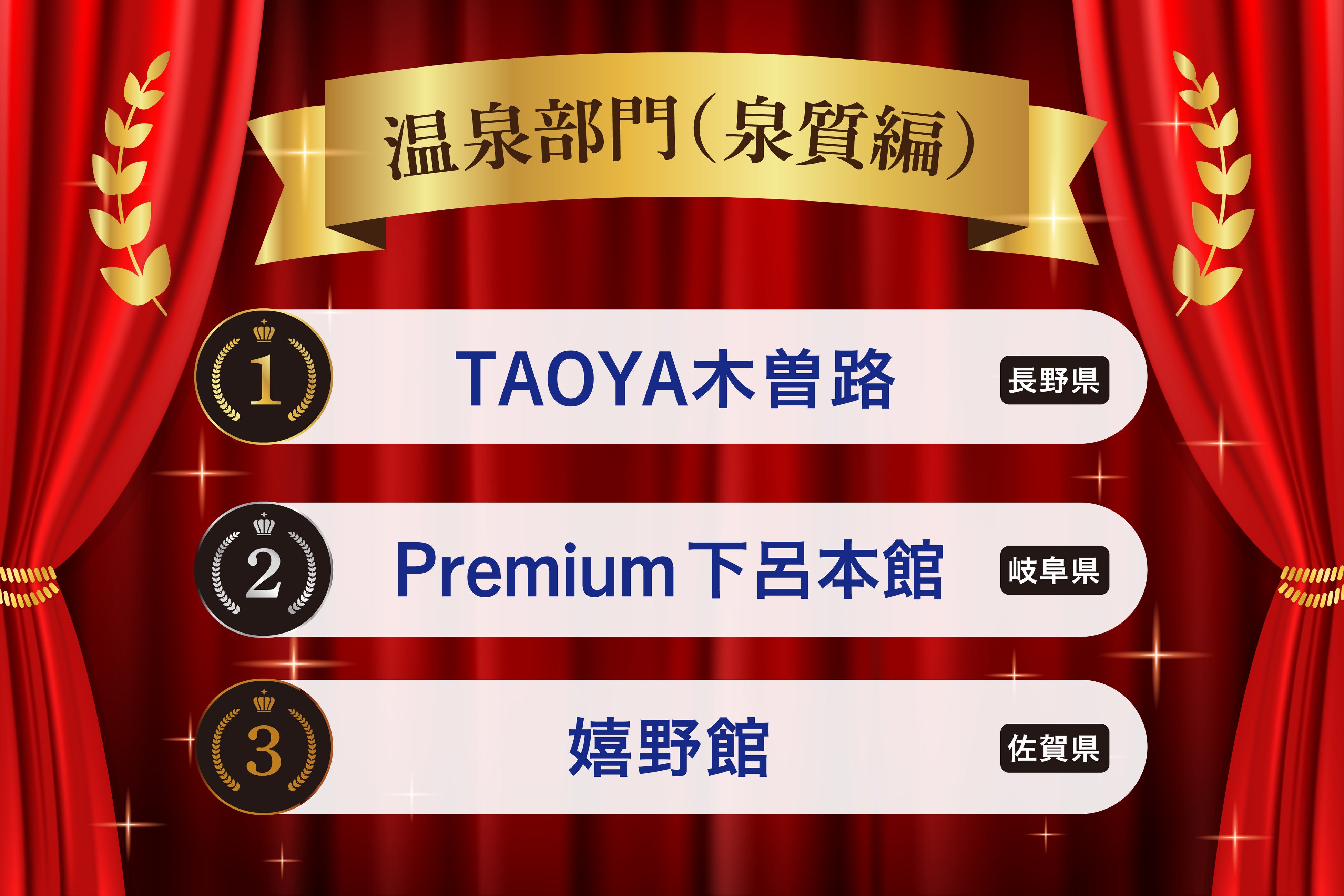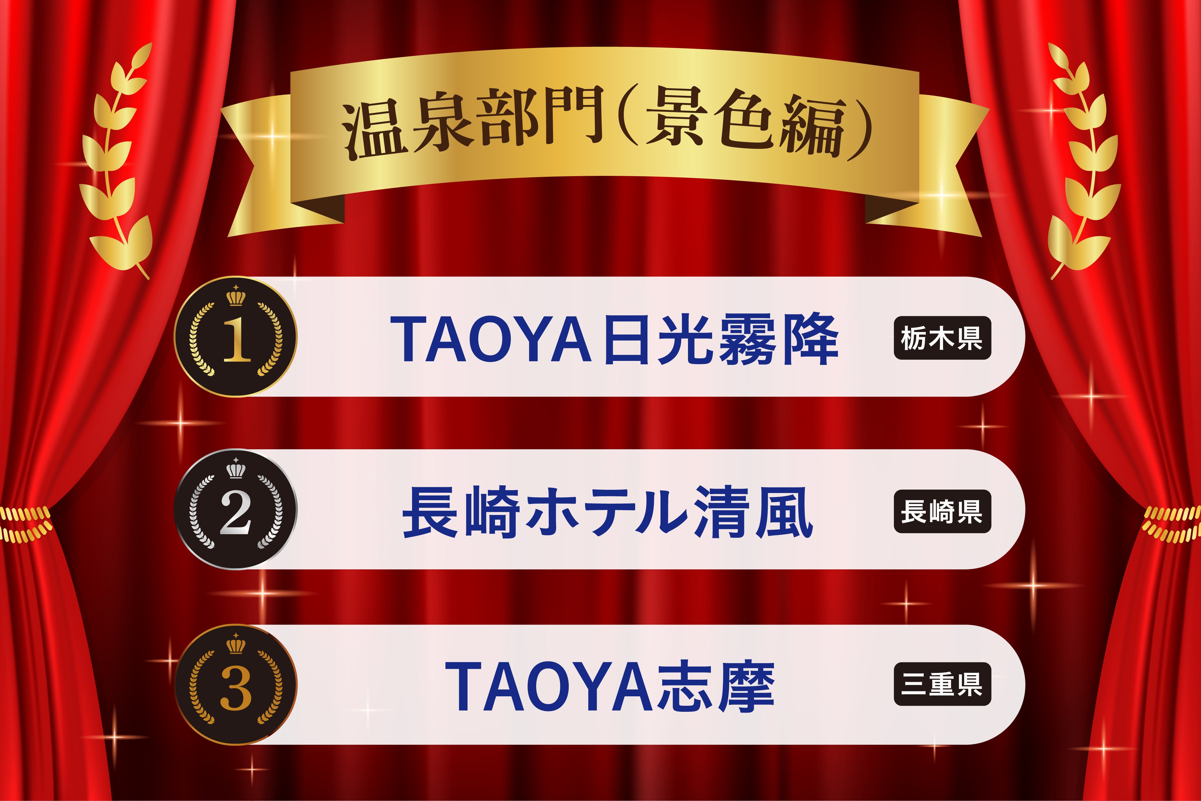 温泉(泉質)部門:ベテランスタッフも太鼓判!泉質の良さで選ばれた「TAOYA木曽路」が堂々の第1位。温泉(景色)部門:「この景色は一生忘れない!」との声も。「TAOYA日光霧降」が第1位に。