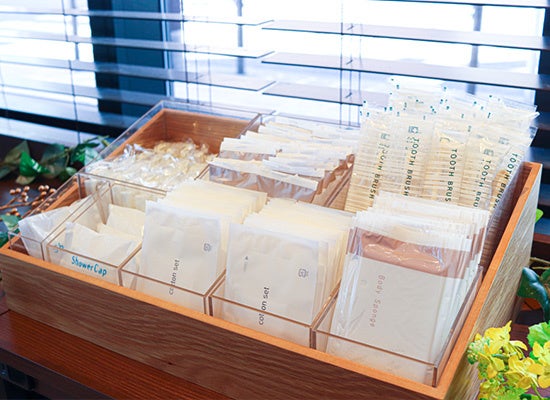 また、SDGs(持続可能な開発目標)の取り組みの一環として、プラスチック削減およびリサイクル促進を目的に、フロントにフリーアメニティコーナーを設置しています。綿棒、コットン、ボディタオル、ヘアブラシ、ヘアゴム、カミソリ、ティーバッグなどを取り揃え、必要な分だけお取りいただくことで、環境負荷の軽減に努めています。