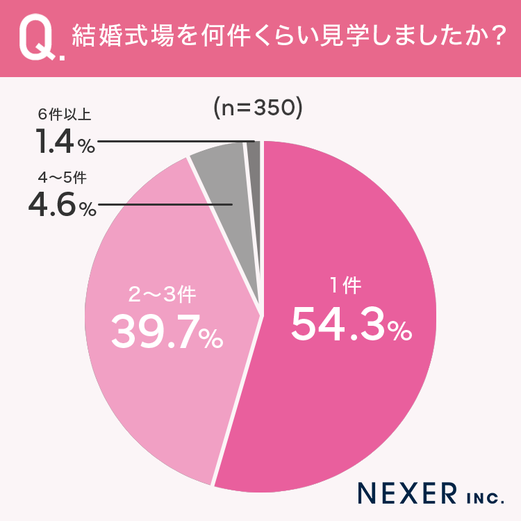 その結果「1件」が54.3%と半数以上を占め、「2~3件」が39.7%、「4~5件」が4.6%、「6件以上」が1.4%となりました。意外にも、複数の式場を比較することなく決定する方が多いようです。