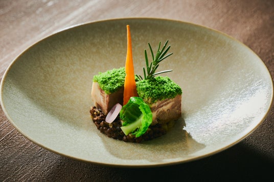 香ばしくふっくらと焼き上げた季節魚のポワレを、和の旨味を重ねた出汁で炊き上げた大阪産米のリゾットとともに。春の味覚の姫竹、蕗、ぜんまいを合わせ、この季節ならではの味わいに仕上げました。トップにあしらった香ばしいチュイルが、サクッとした食感をプラスし、美しい彩りに。抹茶のほのかな香りが全体を包み込み、春風のように軽やかな風味が広がる一皿です。