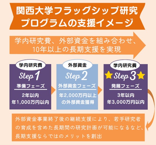 「関西大学が、少子化による受験生の減少という逆風の中でも、発展し続ける大学であるためには、研究力の強化が不可欠です。外部資金を獲得しても、事業期間終了後の継続資金が獲得できずプロジェクトが失速してしまうケースが多々あるが、外部資金事業の終了後も長期的かつ大規模な支援を行うことが本制度の特徴で、若手研究者の育成を含めた長期間の研究計画が可能になるなどのメリットにより、これまでにない研究プロジェクトの広がりが期待されます。トップクラスの実績を有する研究プロジェクトを重点的に支援することで、関西大学の研究力のさらに高めてまいります。」