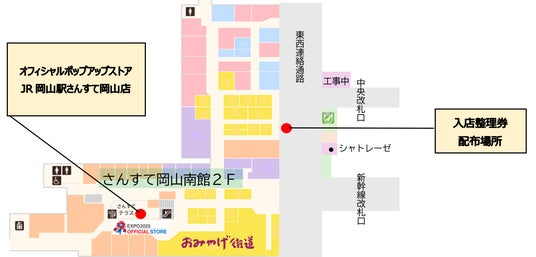 (4)実施内容:入店は入替制( 1回あたり20分、25人 )とし、「2025大阪・関西万博オフィシャルポップアップストアJR岡山駅さんすて岡山店」へは入店整理券に記載された指定時間に限り入店可能です。
