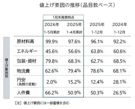 値上げ要因では、2025年のトレンドを引き継ぎ原材料などモノ由来の値上げが多くを占める一方で、特に「人件費」増の影響を受けた値上げの拡大が続いた。26年の値上げ要因のうち、最も大きいものは「原材料高」(99.9%)となり、4年連続で値上げ品目全体の9割を超えた。また、「人件費」由来の値上げは66.2%となり、過去4年で最高水準での推移となったほか、商品パッケージや段ボールなど「包装・資材」由来の値上げ(79.8%)も8割にせまり、人件費同様に過去最高水準となった。トラックドライバーの時間外労働規制などが要因となった輸送コストの上昇分を価格に反映する「物流費」由来の値上げは62.6%となり、前年通年(78.6%)から大幅に低下した。電気・ガス代など「エネルギー」(45.6%)、「為替の変動(円安)」(2.0%)はともに前年を下回り、過去4年で最低となった。