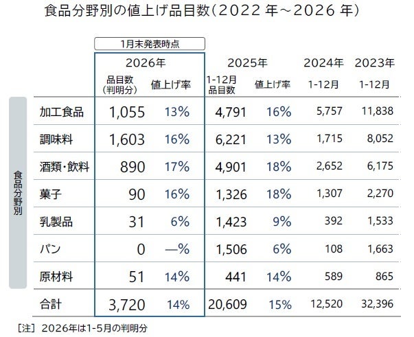 2026年通年の値上げは5月までの累計で3720品目となり、年間の平均値上げ率は14%に達した。25年1月31日時点で判明した年間値上げ予定品目数合計(8867品目)に比べ、6割減のペースで推移したほか、平均値上げ率も低下傾向が続いており、26年は春先にかけて比較的値上げが落ち着いて推移する見通し。コメのほか、チョコレートの原料となるカカオ豆、コーヒー豆などの高騰を背景とした値上げや、一部で円安の進行による値上げ機運もみられるものの、単月で1千品目を超えるのは4月のみ(2320品目)にとどまった。
