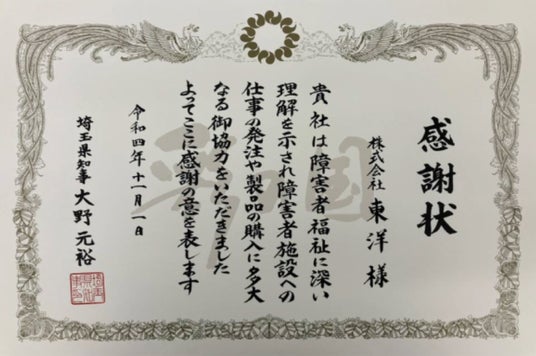 2021年4月1日から行田店にて、福祉施設支援のクレーンゲーム「毎日焼きたてパンキャッチャー」を展開している株式会社東洋ですが、継続的な取り組みや実績が評価され、令和4年11月1日に「障害者就労施設応援企業」に認定され、感謝状を授与頂きました。また令和5年10月23日には「令和5年度 埼玉県障害者就労支援施設プレミアムパートナー」に認定されました。